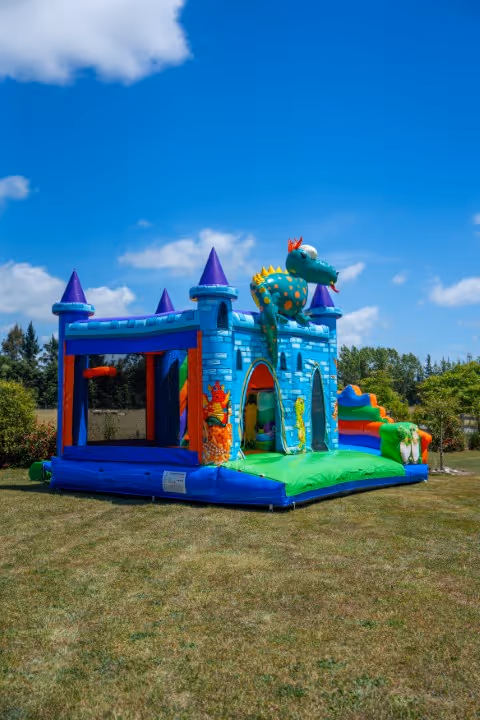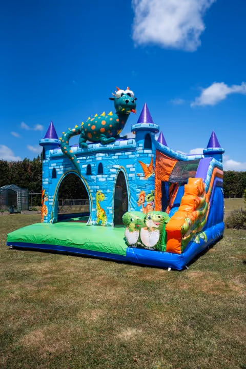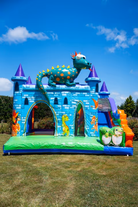 A fantastic dragon theme bouncy castle with slide and obstacles within.