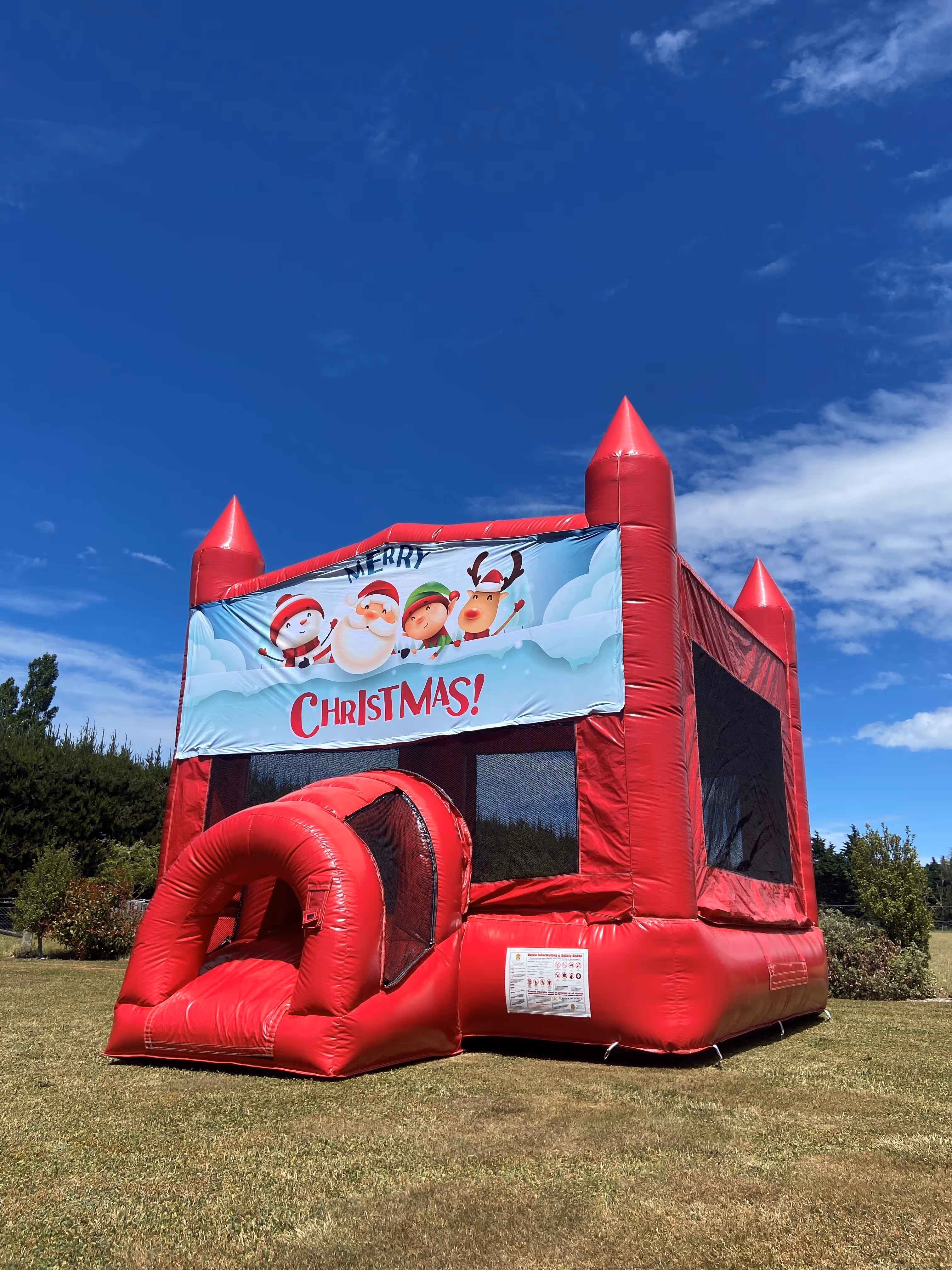 We wanted a Christmas bouncy castle, so decided to get the good people at the Create Design Studios in Rangiora to design us a banner for our Simply Red castle. Ideal for Christmas parties. The bouncy castle is large and has cooling vents in each corner