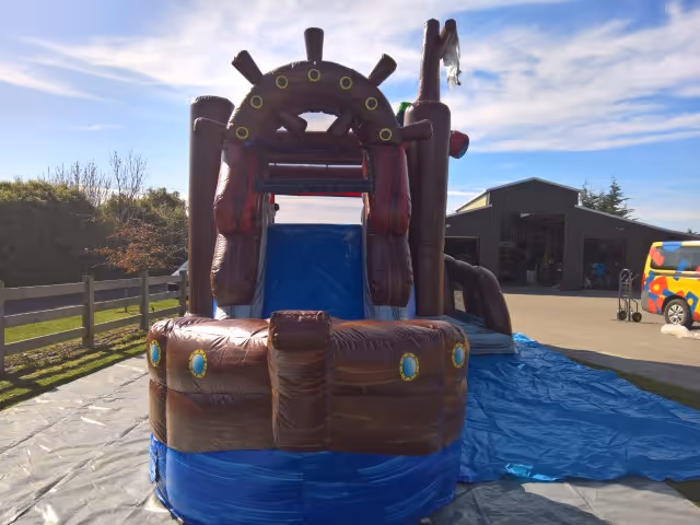 A pirate themed wet/dry bouncy castle with slide