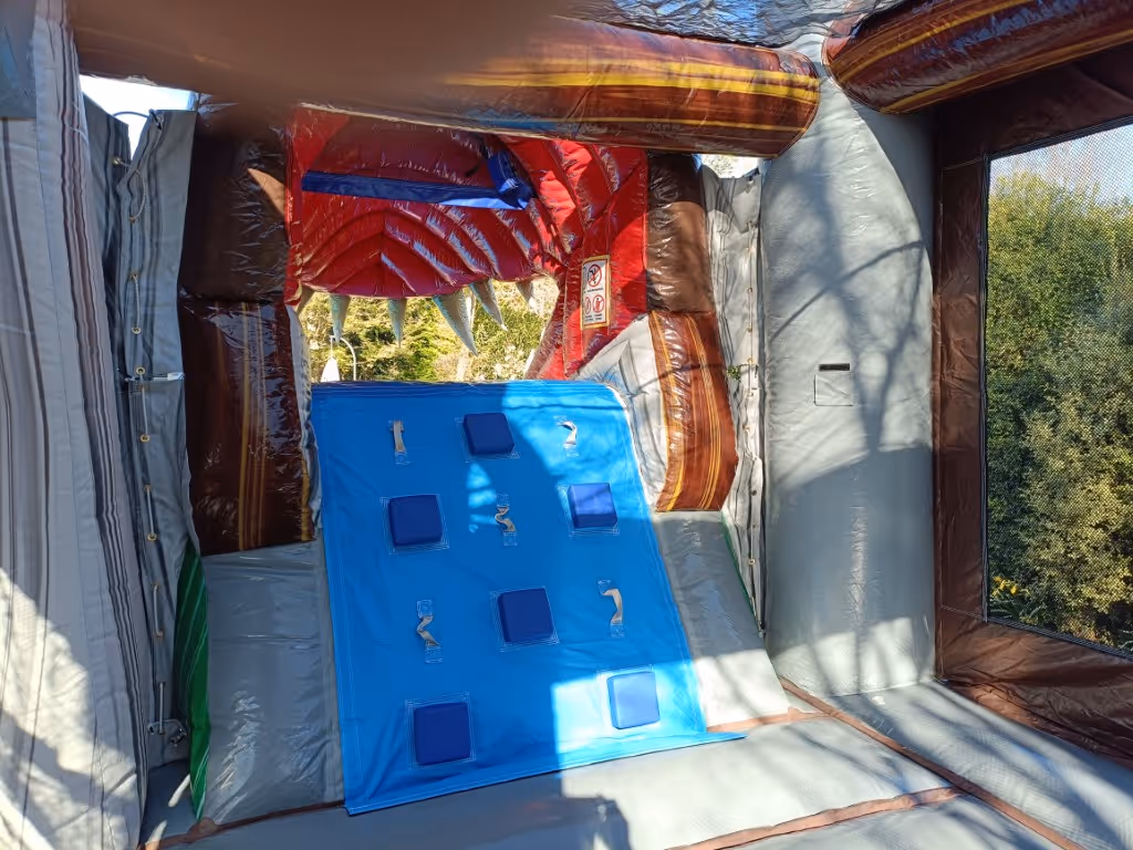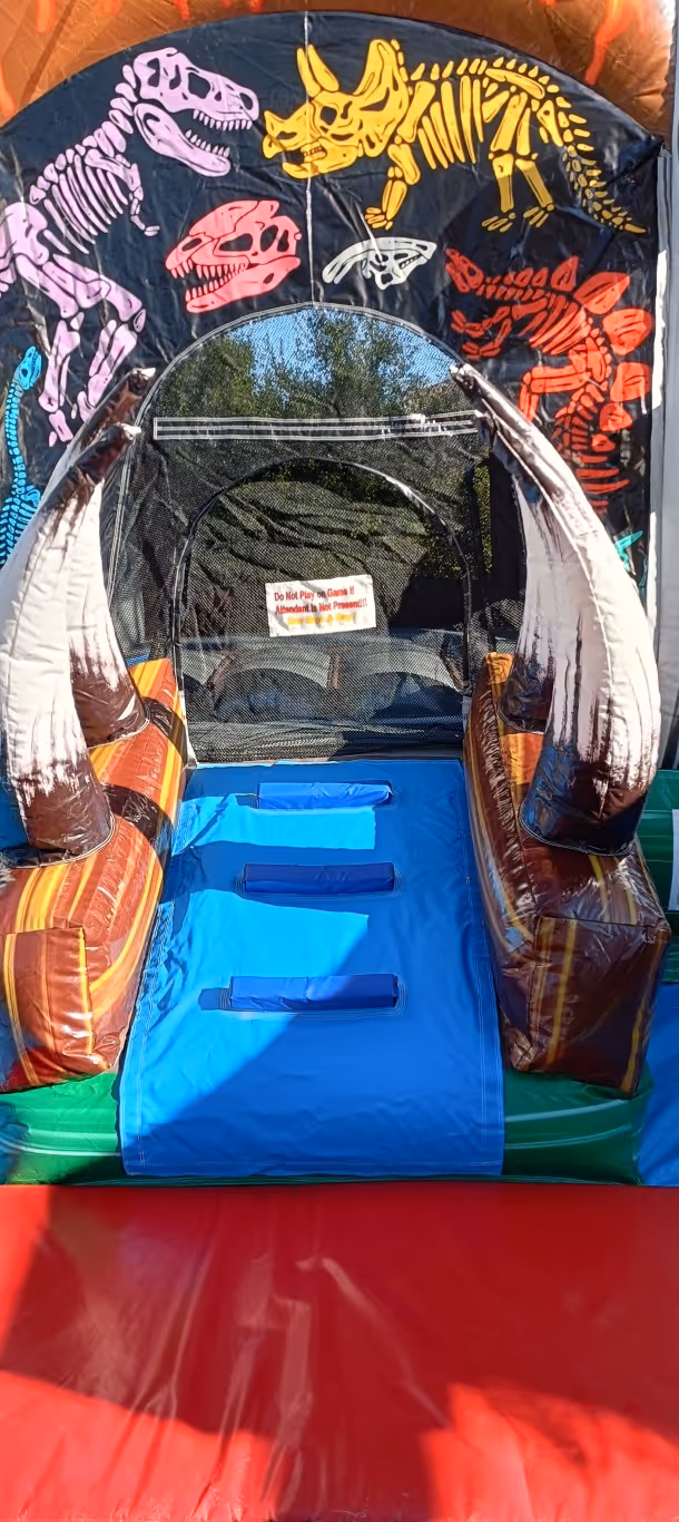 A dinosaur themed wet/dry bouncy castle with slide