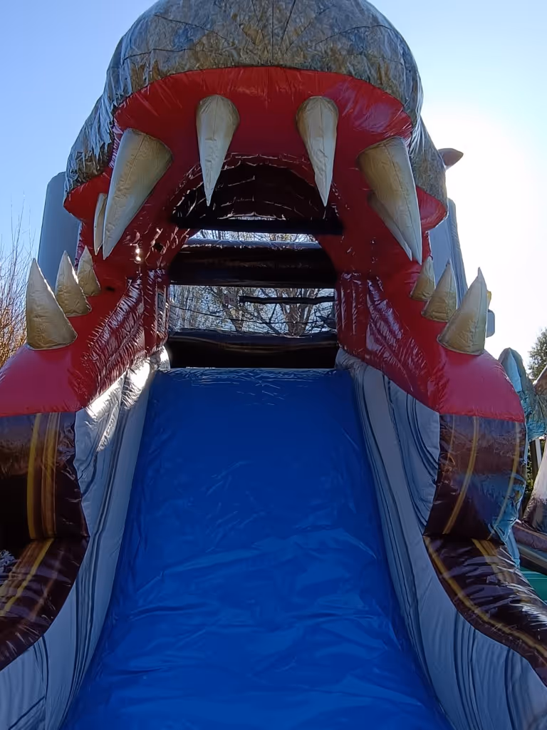 Our T-Rex dinosaur bouncy castle is a wet and dry unit. Enter via the tunnel to the large bouncing area. A climb up to the slide and down you go! If used wet, a hose is attached to a dripper above the slide with a draining pool at the bottom of the slide. Inside the 4 columns have have cool-air holes, to provide a small breeze on hot days
